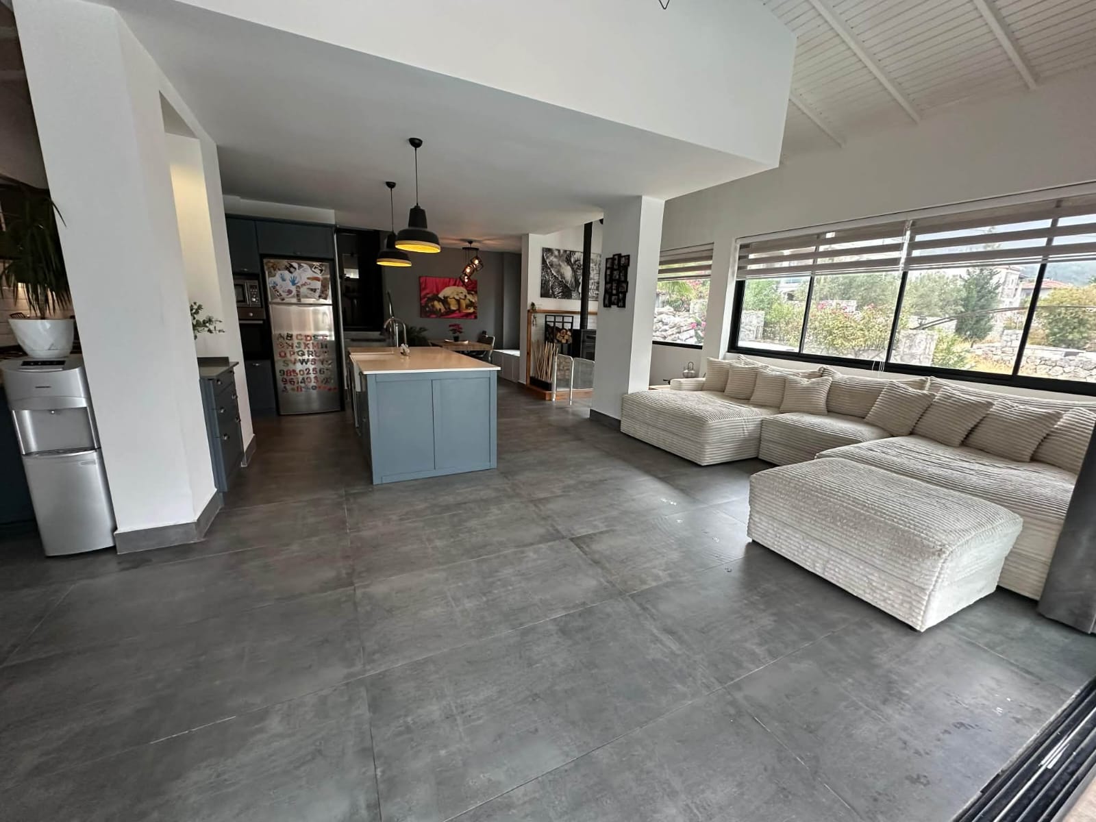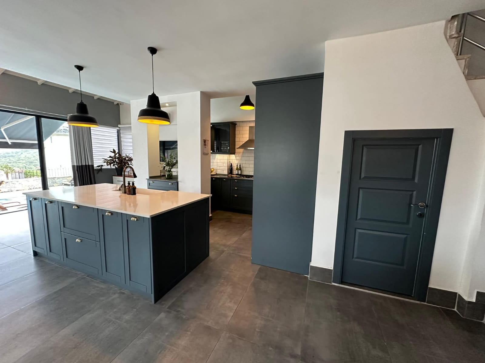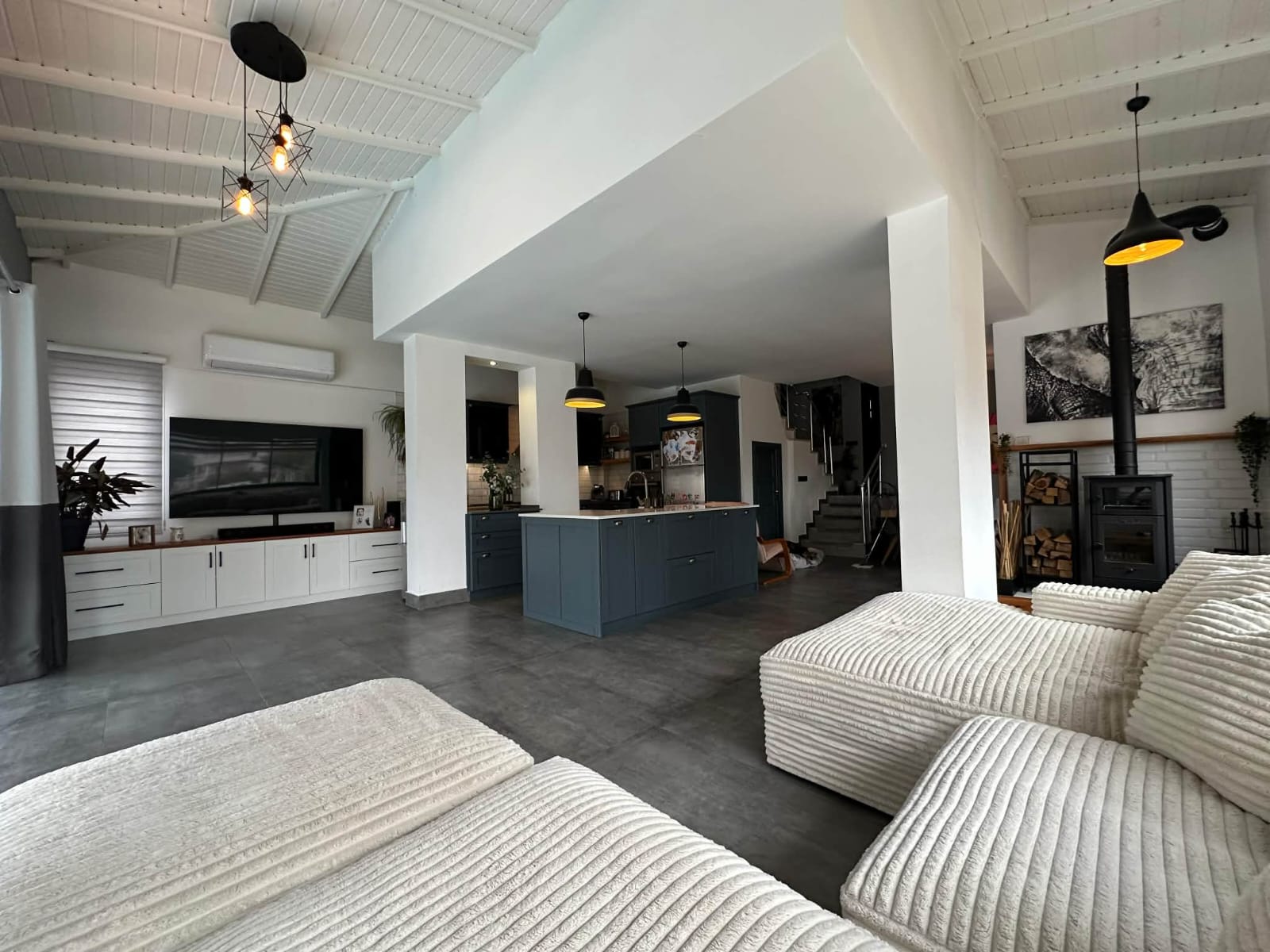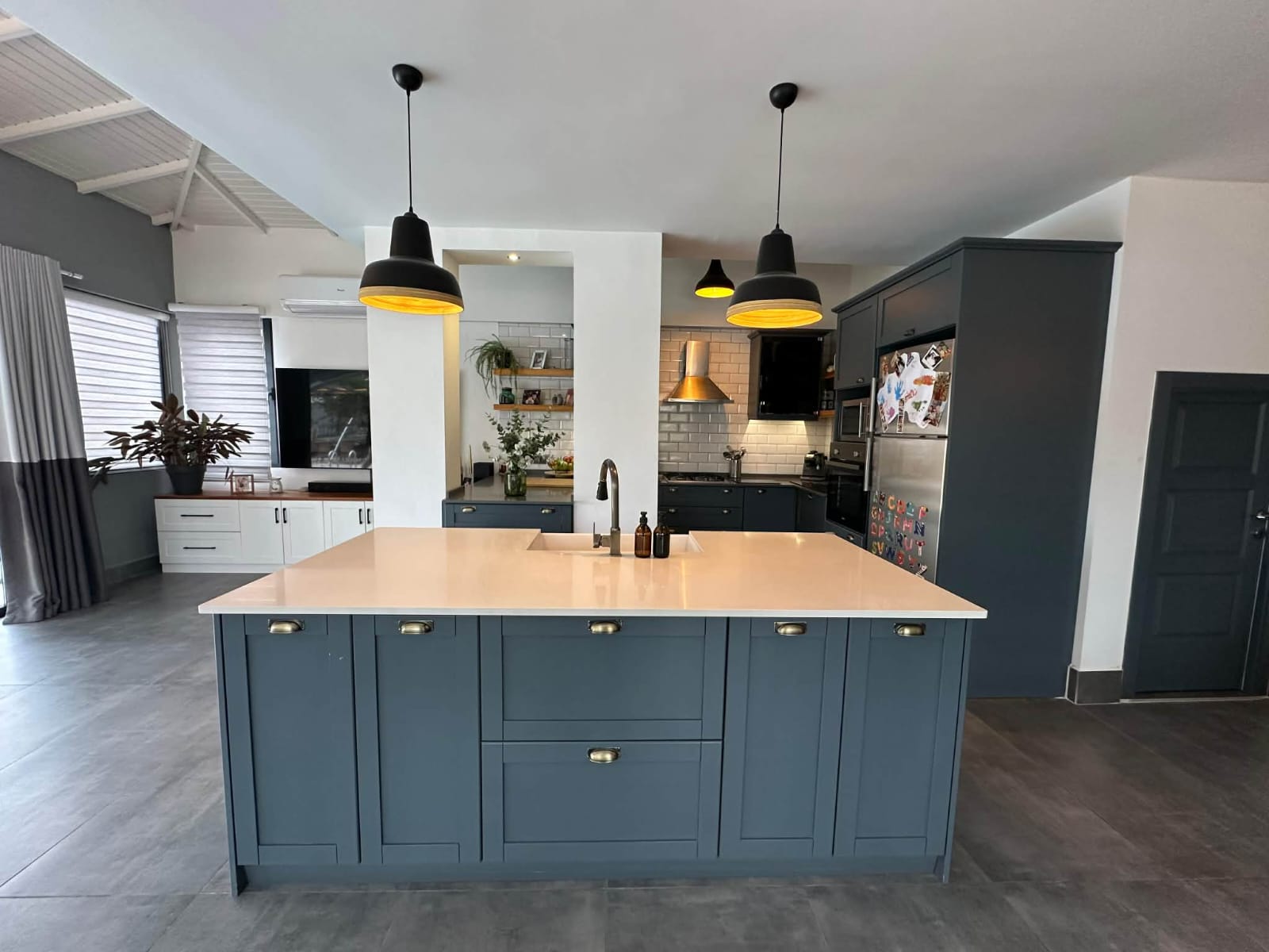 The main living floor has been significantly enhanced by extending the original balcony to create an impressive open-plan lounge, dining, and kitchen area. This expansive living space forms the heart of the home, ideal for entertaining or relaxing with family and friends. The contemporary island kitchen is fully fitted with modern appliances and ample storage, while large windows and sliding doors flood the area with natural light and seamlessly connect the indoors with the outdoor living spaces. Air conditioning is installed in every room, ensuring comfort throughout the year.