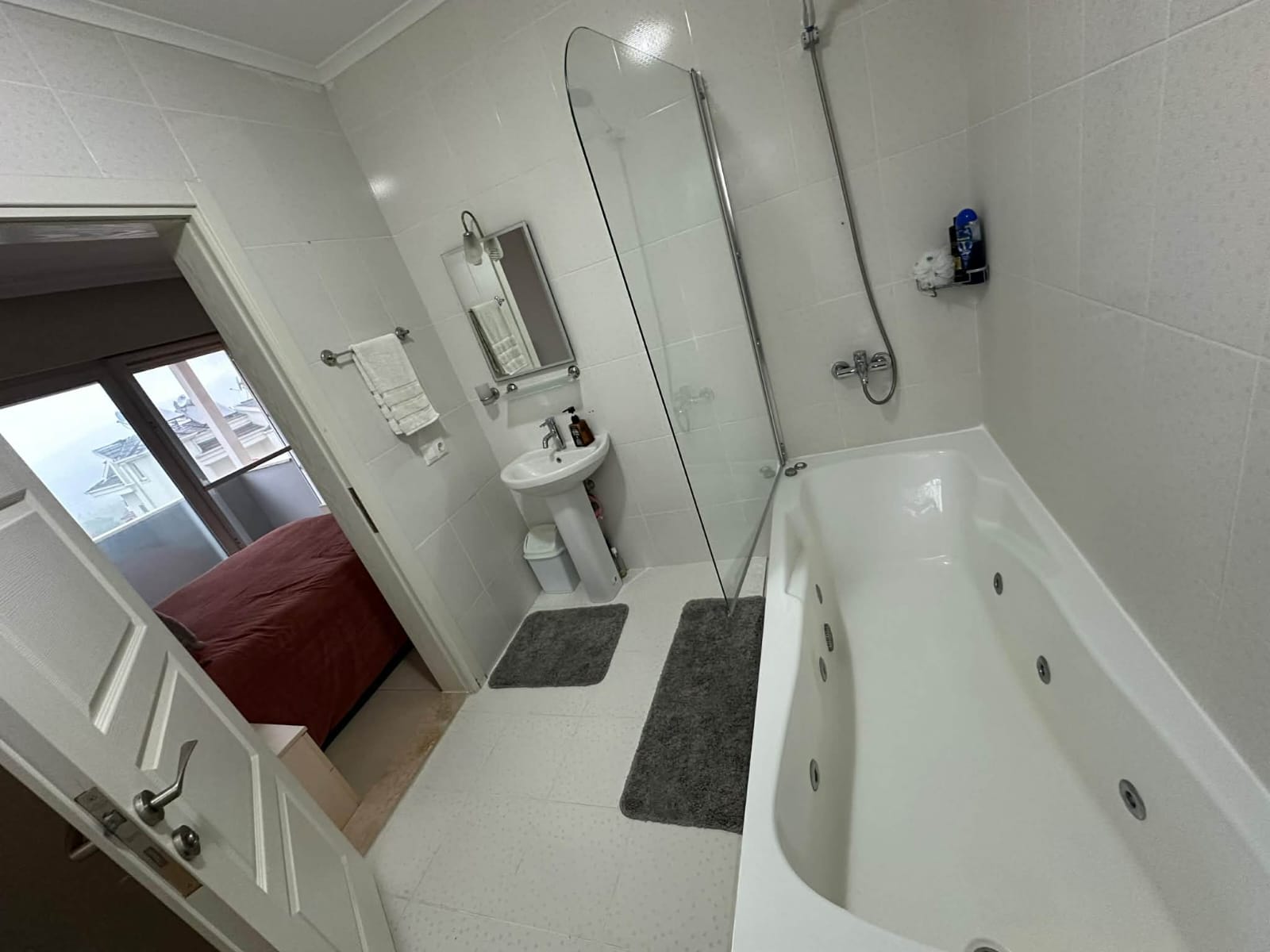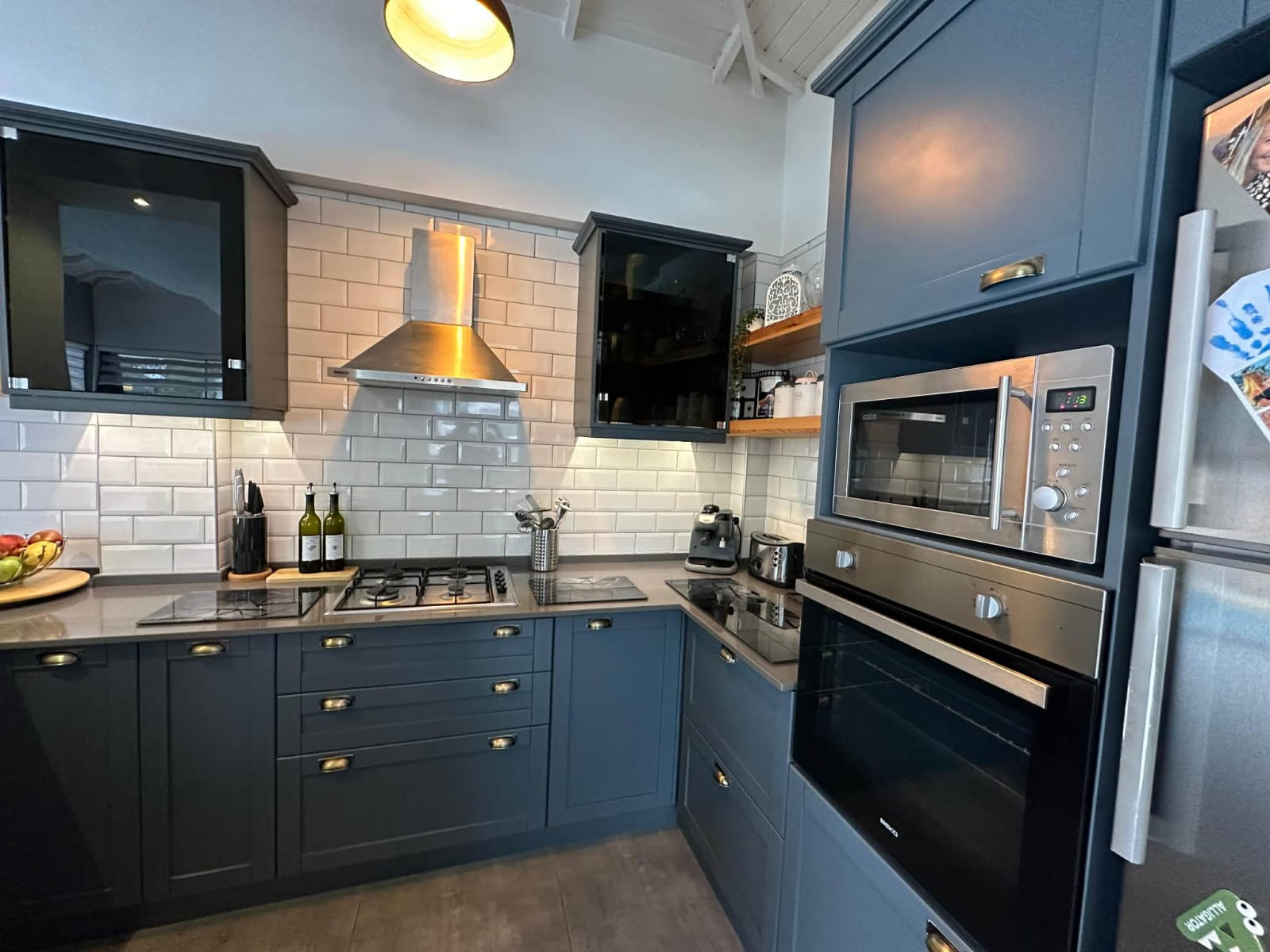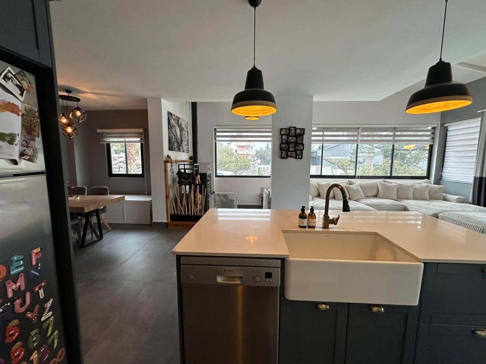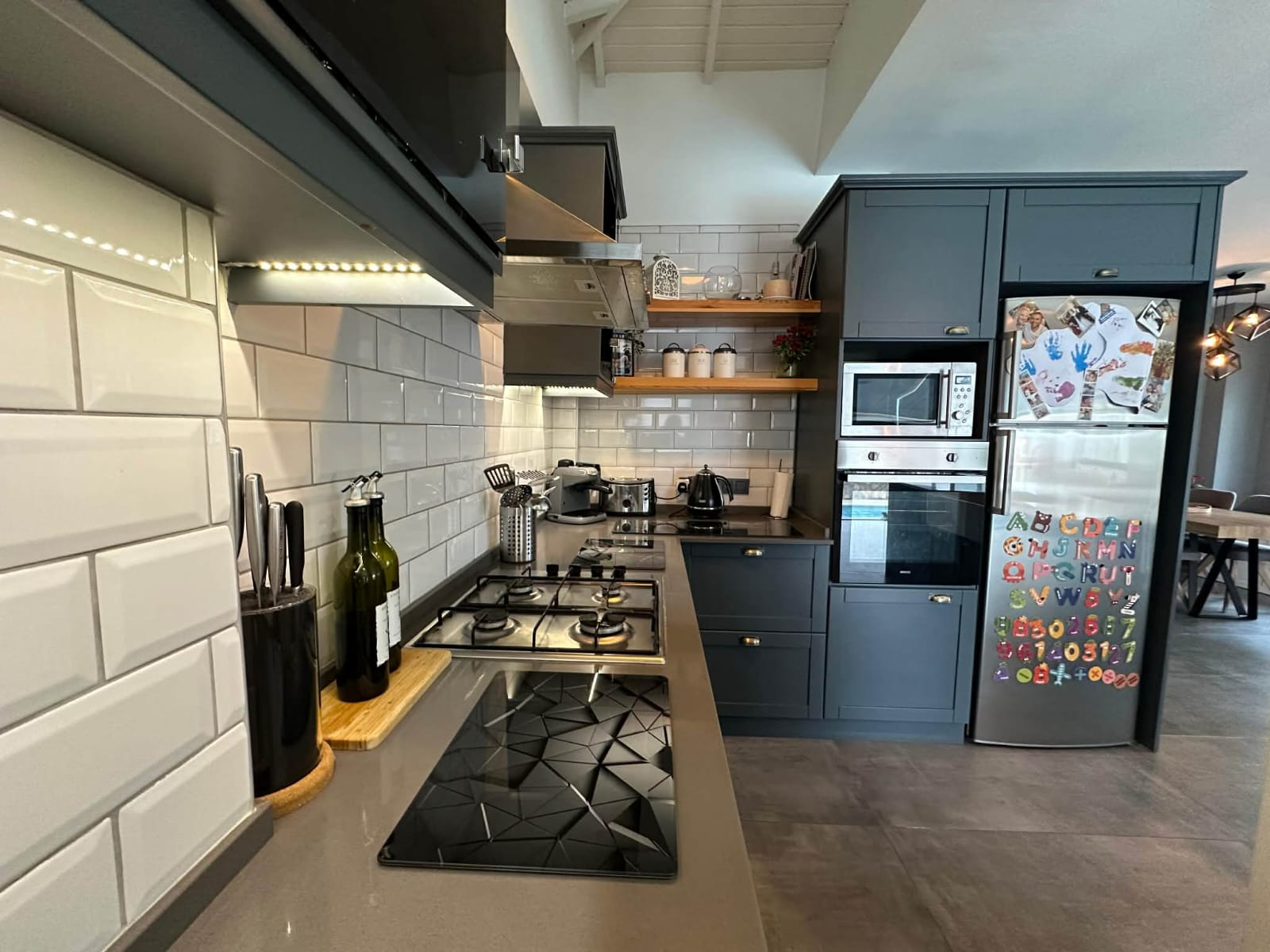 The main living floor has been significantly enhanced by extending the original balcony to create an impressive open-plan lounge, dining, and kitchen area. This expansive living space forms the heart of the home, ideal for entertaining or relaxing with family and friends. The contemporary island kitchen is fully fitted with modern appliances and ample storage, while large windows and sliding doors flood the area with natural light and seamlessly connect the indoors with the outdoor living spaces. Air conditioning is installed in every room, ensuring comfort throughout the year.